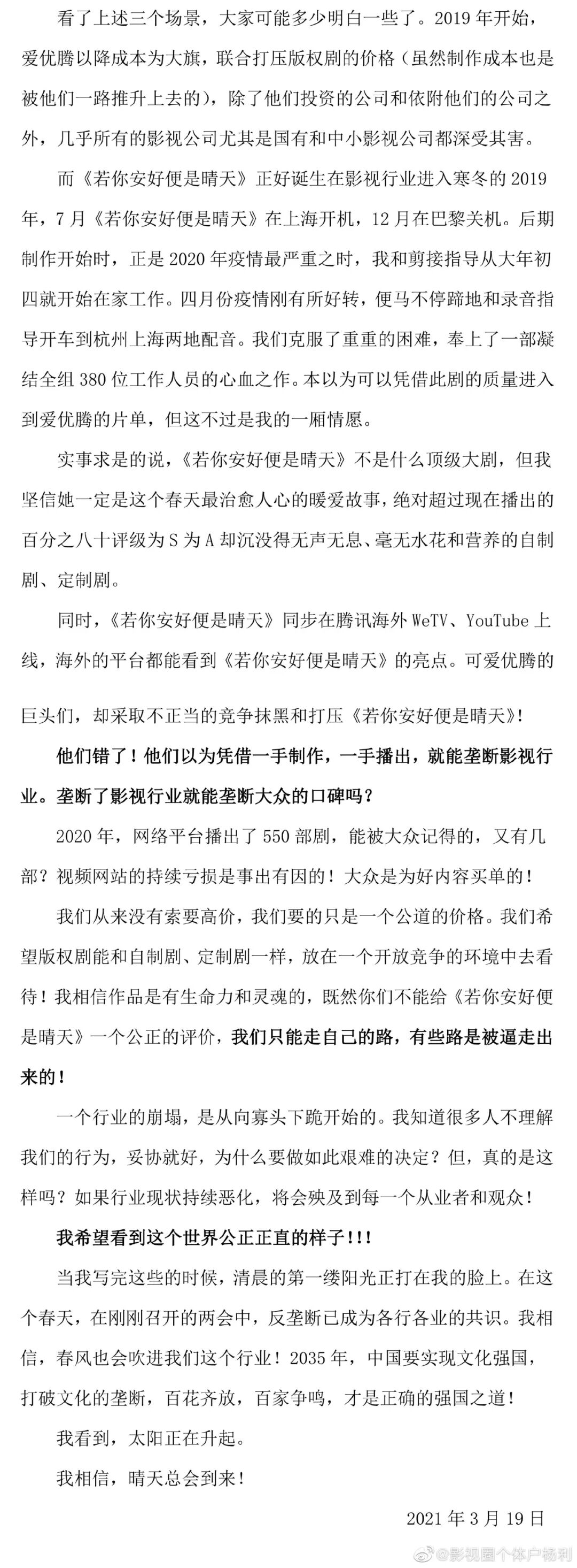 《若你安好便是晴天》最终什么都没有等来,成为了近几年第一部在一线卫视播出,却无缘网络视频平台的作品。制片人杨利无奈地把自己的经历发到微博上,“爱优腾所做的一切就是为了在剧开播的最后时刻将价格联合打压在地板上,期望绝对的垄断电视剧这个行业。”