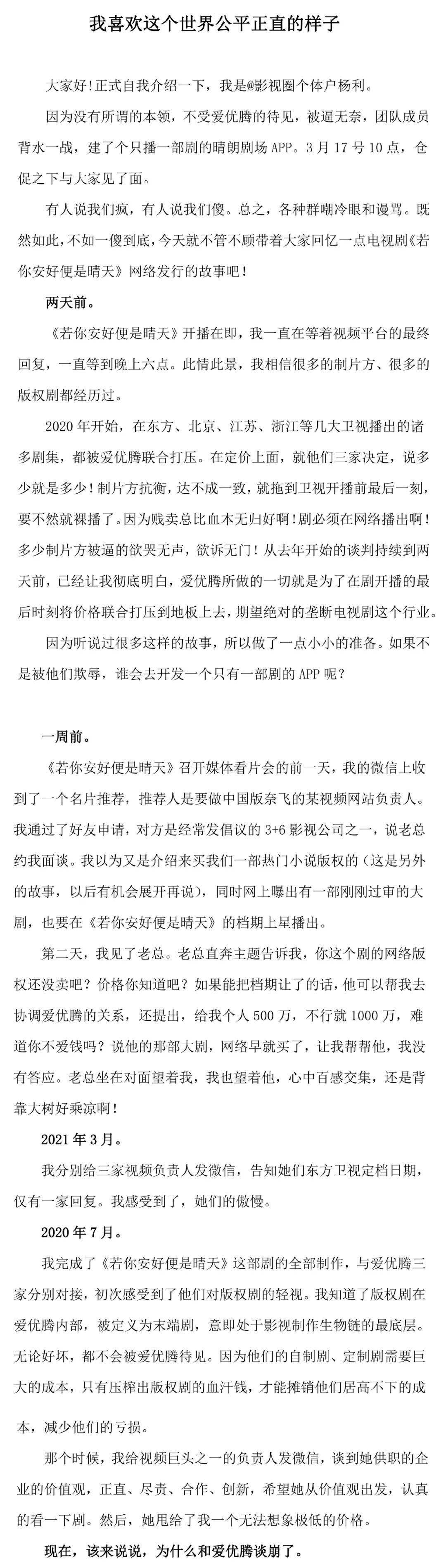 尽管这次试水的结果是栽了跟头,但在剧集播出时刻,杨利还是选择站出来呼吁一个平等的竞争环境。