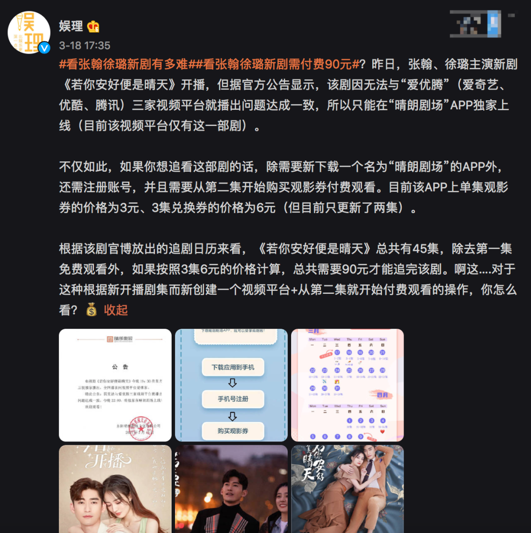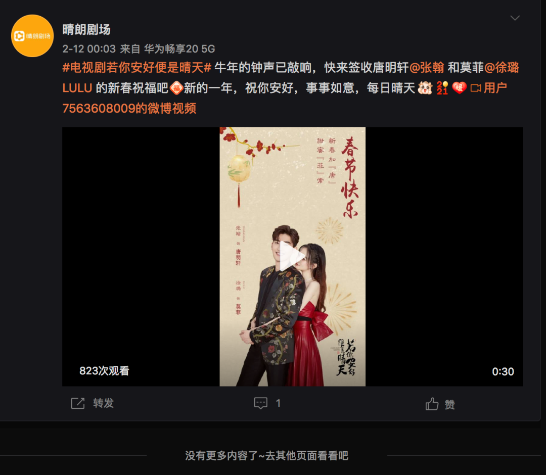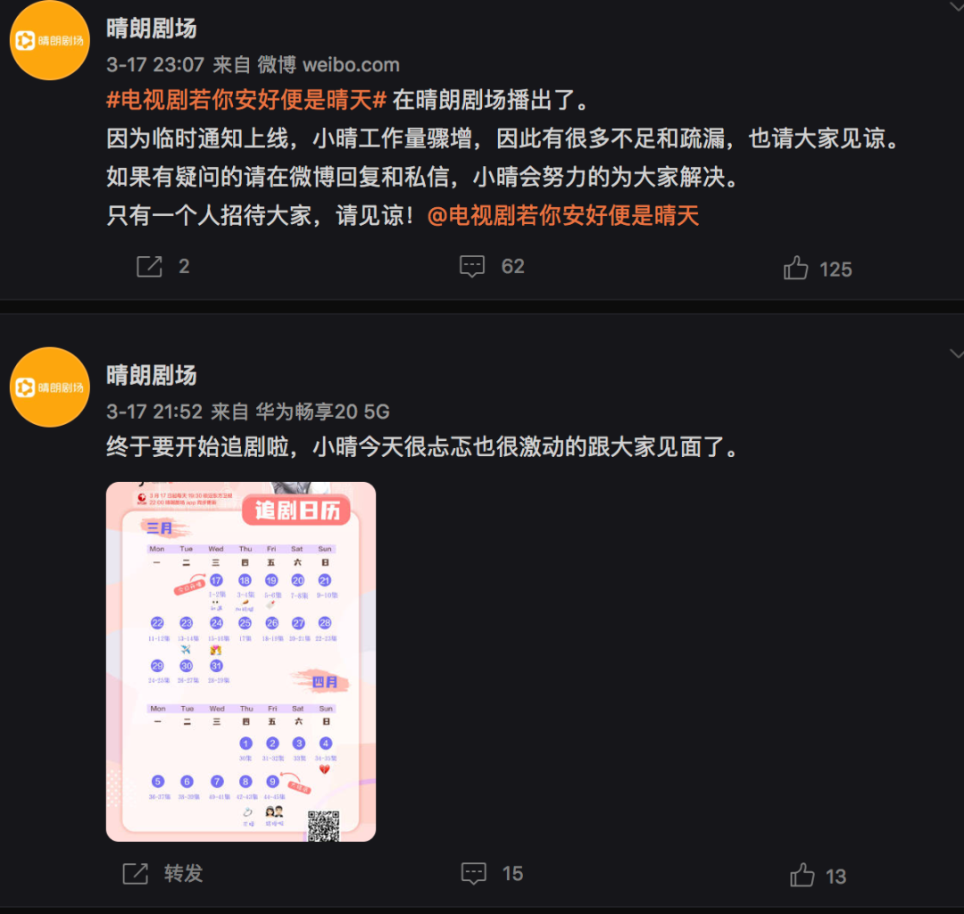 截图自《若你安好便是晴天》播出平台晴朗APP官博