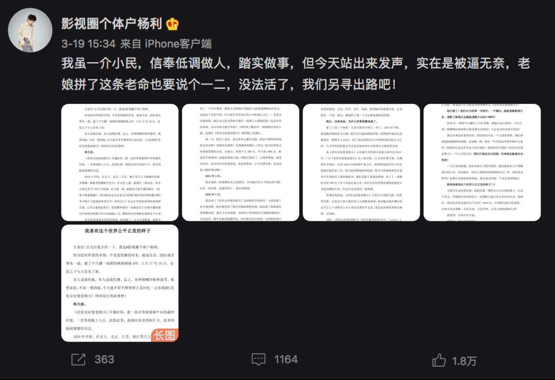 3月17日晚上6点,是杨利等待的最后期限,她在等视频平台给她的最后答复。