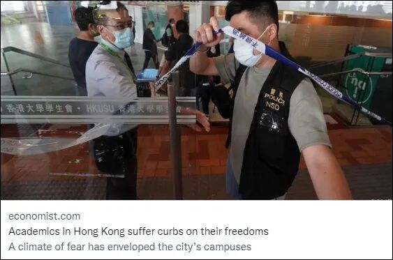 今年7月24日,《经济学人》刊登了黄淑琳一篇题为“香港学者自由受限,恐惧气氛笼罩校园”的文章,以香港警方搜查港大学生会为切入点,大谈香港的学术自由如何受到“压制”,学生会如何走向式微。