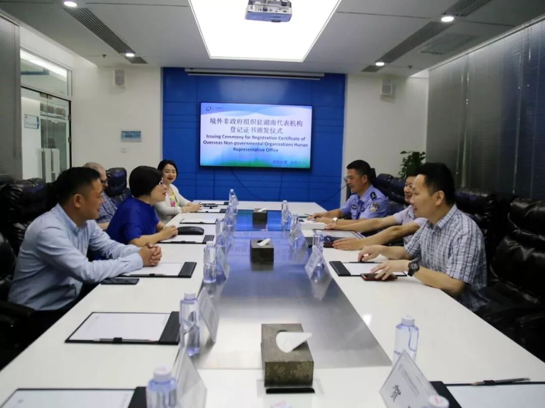 近日,湖南省公安厅境外非政府组织管理办公室为入驻长沙高新科技商务平台的贾诺·麦基斯得(意大利)湖南代表处、奥地利中国和平统一促进会湖南代表处以及马来西亚-中国友好协会湖南代表处3家代表机构颁发登记证书。