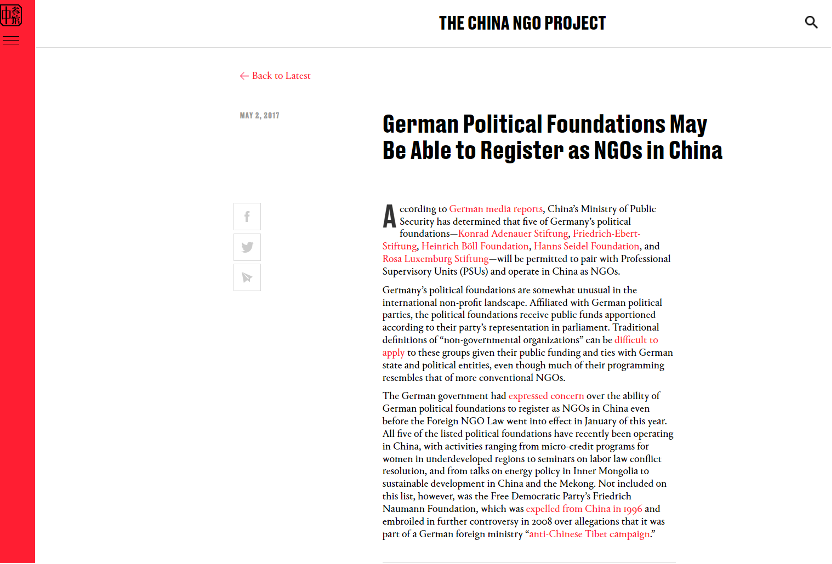 根据“中参馆”的信息,2017年,以海因里希·伯尔基金会为代表的5家德国基金会以NGO身份在中国运营。这些基金会均是德国政党的附属组织,其中海因里希·伯尔基金会是德国绿党的御用智库。
