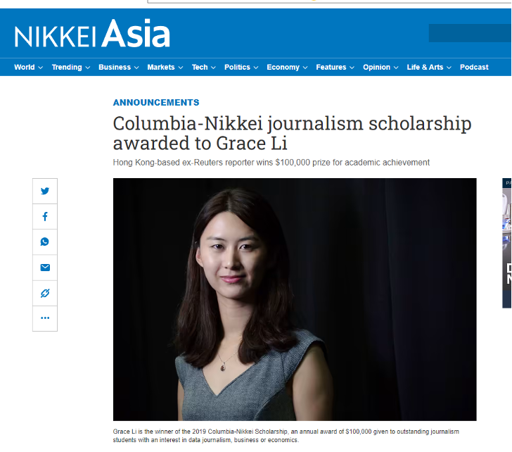 Grace Li在获奖感言中表示:“我非常感谢日经新闻资助了我在哥伦比亚新闻学院的研究。数据新闻项目让我具备了编程和可视化技能,可以利用数据发现并报道新闻。《日本经济新闻》为来自亚洲的记者提供了这样一个很好的培训机会,让他们为未来的新闻事业做好准备,这真是太棒了。”