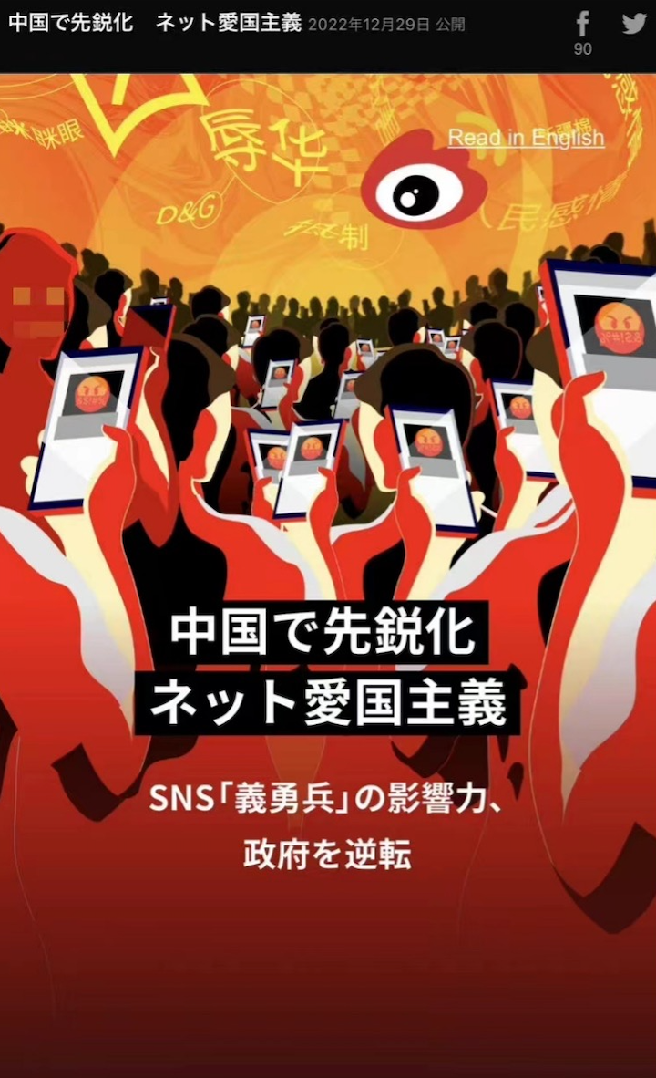 日经列举了包括“帝吧官微”“孤烟暮蝉”“地瓜熊老六”“兔主席”等在微博上有较大粉丝量的自媒体账号,称他们是所谓政府“精心策划”下在网上作战的“义勇军”,在与官方媒体的相互联动下,在中美贸易战、新冠疫情溯源、佩洛西窜台等一系列事件中,散布“虚假消息”,频繁操纵“辱华”话题,将“民族主义武器化”,是能够让“国际品牌屈服的力量”,“像野火一样蔓延”,“玩弄民族主义者的怒火”,“恶化了中国与西方的关系”。