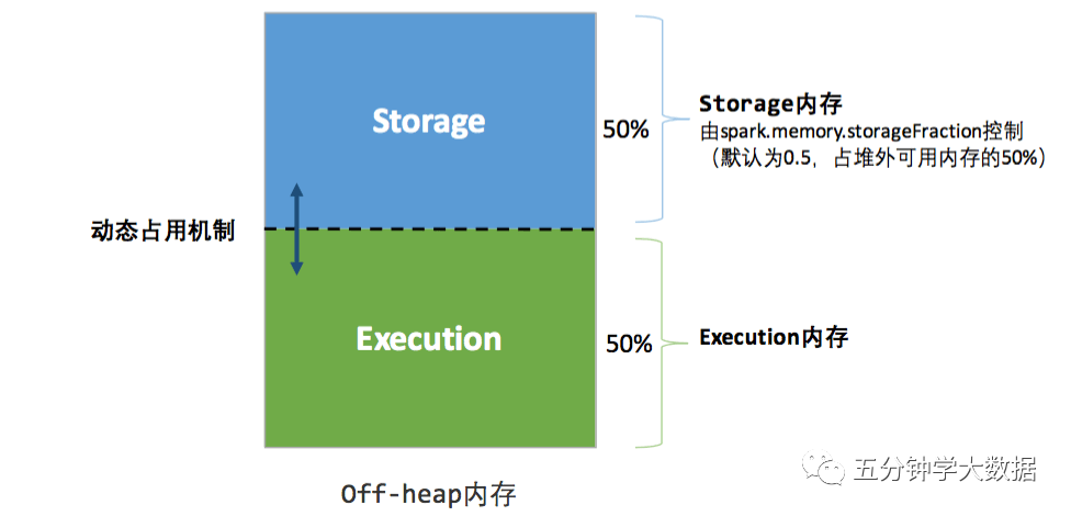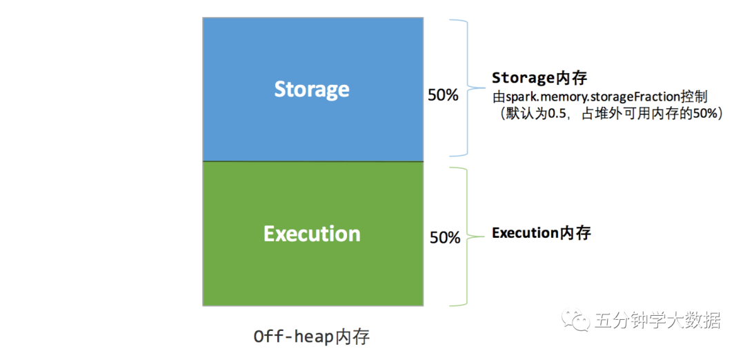 堆外的空间分配较为简单,只有存储内存和执行内存,如下图所示。可用的执行内存和存储内存占用的空间大小直接由参数 spark.memory.storageFraction 决定,由于堆外内存占用的空间可以被精确计算,所以无需再设定保险区域。