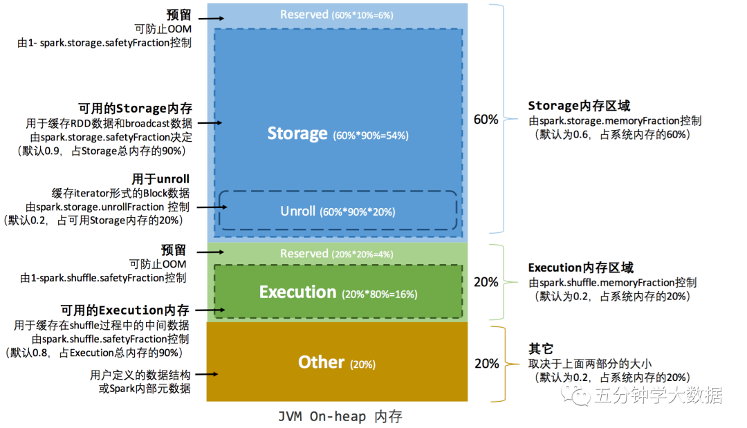 其中 systemMaxMemory 取决于当前 JVM 堆内内存的大小,最后可用的执行内存或者存储内存要在此基础上与各自的 memoryFraction 参数和 safetyFraction 参数相乘得出。上述计算公式中的两个 safetyFraction 参数,其意义在于在逻辑上预留出 1-safetyFraction 这么一块保险区域,降低因实际内存超出当前预设范围而导致 OOM 的风险(上文提到,对于非序列化对象的内存采样估算会产生误差)。值得注意的是,这个预留的保险区域仅仅是一种逻辑上的规划,在具体使用时 Spark 并没有区别对待,和"其它内存"一样交给了 JVM 去管理。