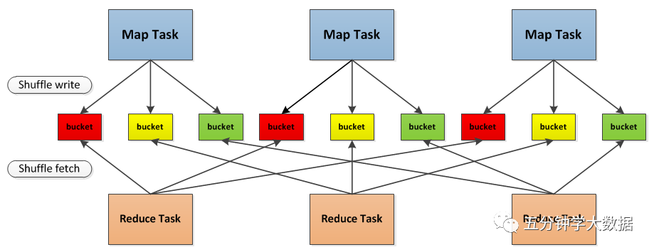 首先每一个Mapper会根据Reducer的数量创建出相应的bucket,bucket的数量是MM×RR,其中MM是Map的个数,RR是Reduce的个数。