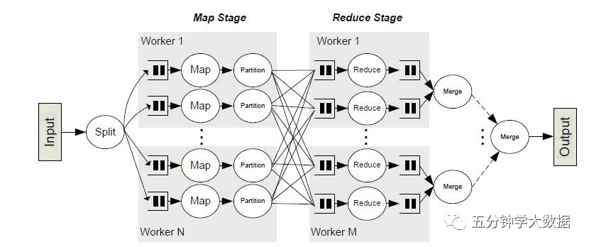其次Mapper产生的结果会根据设置的partition算法填充到每个bucket中去。这里的partition算法是可以自定义的,当然默认的算法是根据key哈希到不同的bucket中去。