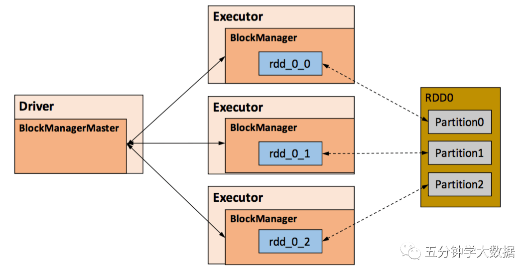 RDD 的持久化由 Spark 的 Storage 模块负责,实现了 RDD 与物理存储的解耦合。Storage 模块负责管理 Spark 在计算过程中产生的数据,将那些在内存或磁盘、在本地或远程存取数据的功能封装了起来。在具体实现时 Driver 端和 Executor 端的 Storage 模块构成了主从式的架构,即 Driver 端的 BlockManager 为 Master,Executor 端的 BlockManager 为 Slave。Storage 模块在逻辑上以 Block 为基本存储单位,RDD 的每个 Partition 经过处理后唯一对应一个 Block(BlockId 的格式为 rdd_RDD-ID_PARTITION-ID )。Master 负责整个 Spark 应用程序的 Block 的元数据信息的管理和维护,而 Slave 需要将 Block 的更新等状态上报到 Master,同时接收 Master 的命令,例如新增或删除一个 RDD。