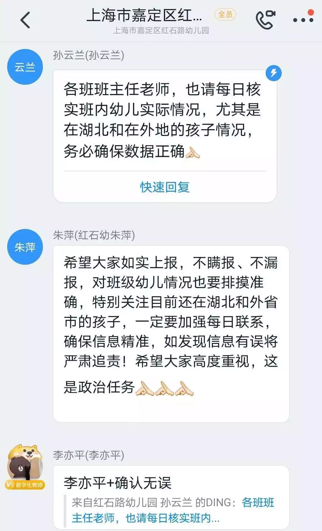 严格落实学生健康状况“日报告、零报告”制度,对幼儿园师生每天健康状况、是否有疫区接触史进行逐一排查、登记,实时掌握广大教职工与学生家庭成员的情况、筑牢疫情“防火墙”。上海各区各园的信息报送、后勤工作都毫不松懈。