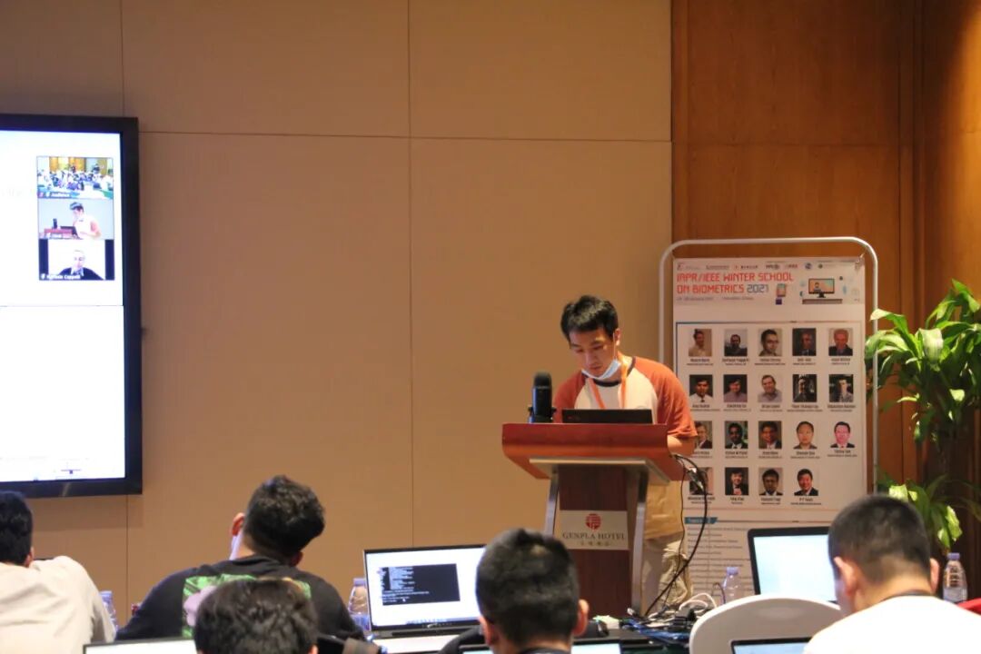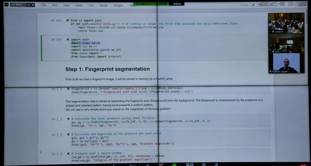 之后,由来自意大利博洛尼亚大学的Raffaele Cappelli教授主讲,Norman Poh主持。Cappelli教授用实机演示的方式向同学们讲解了如何使用传统的指纹特征提取方法,进行指纹识别。从分割脊线图案、估计脊线方向和频率,再到增强脊线图案和细节检测,每一个步骤都用python+OpenCV展示了具体的例子,生动而又形象。