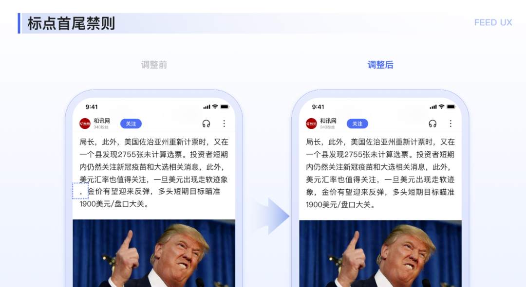 但在实际UI界面中,我们无法在生产端对作者使用的不规范标点符号进行逐一的确认、修正。UI需要的是展示规则,保证多种内容最后都能有良好的视觉呈现。
