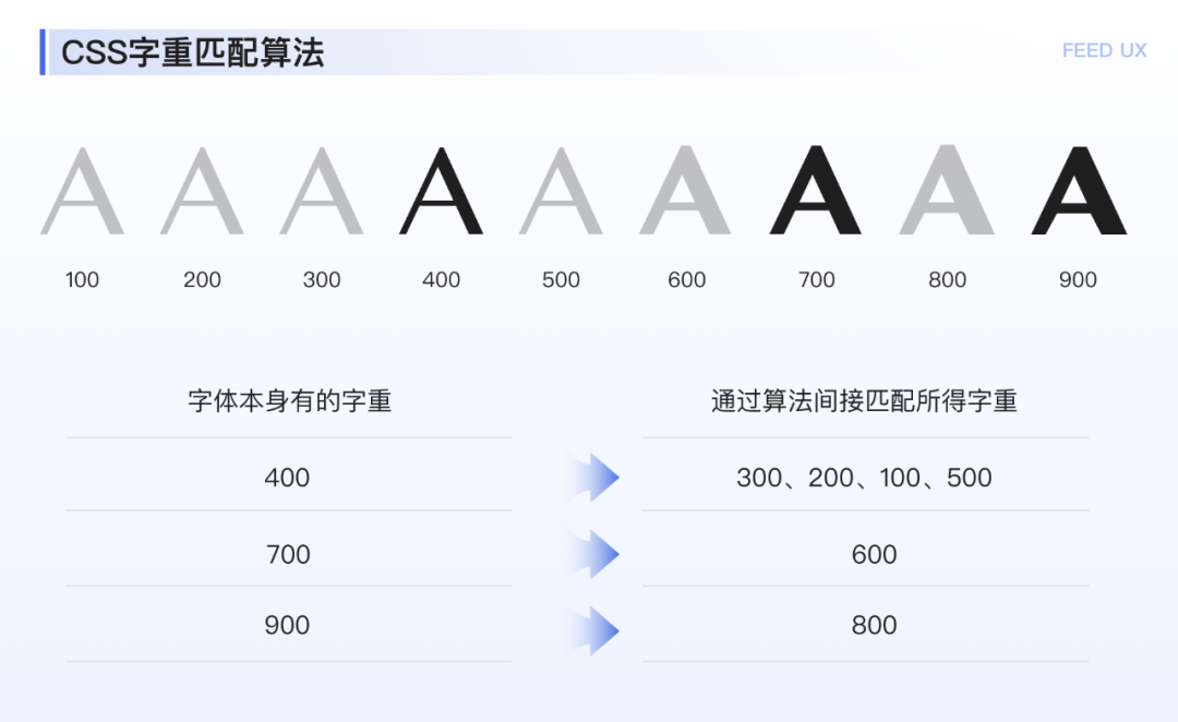 但通常一个特定的字体家族仅会包含少数的可用重量。若一个指定的字重不存在时,CSS会就近匹配其他字重:较重的字重映射到更重的重量、较轻的字重会映射到更轻的重量。