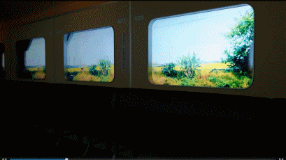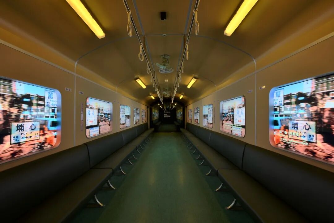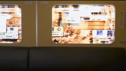 这展区布成台铁普通车车厢的样子。窗外风景,从田野风光,一路到繁忙的大城市