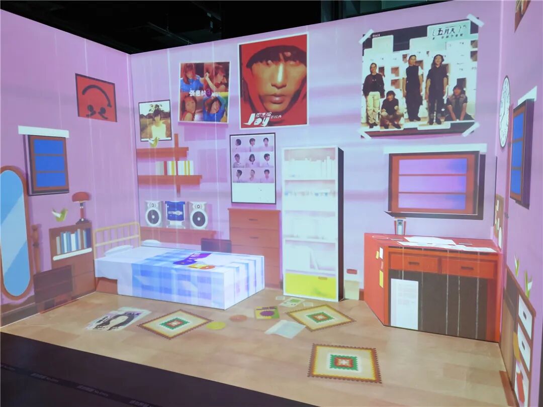 这是一个留白的空间,随着不同年代,不同歌曲,投影变换着几十年来不同世代年轻人的房间样式。