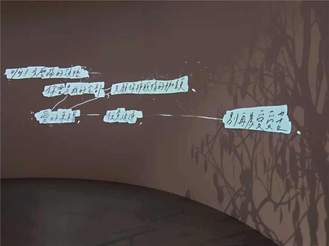 一处纯白的空间,纯白的钢琴,纯白的枯树,树上挂满歌词,背景投影着耳边传来歌曲的一字一句,这展厅是”音乐爱情故事”,由张艾嘉作讲述者。