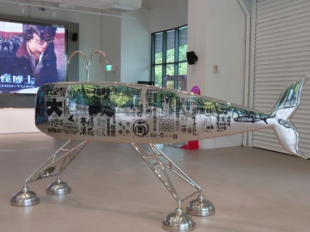 入口处可以见到”音乐鲸鱼”,这是台湾流行音乐设计先驱李明道老师的作品,你看到鱼身上那些知名专辑的LOGO字样,包括背面五月天的专辑字型,都是出自李老师的手笔。