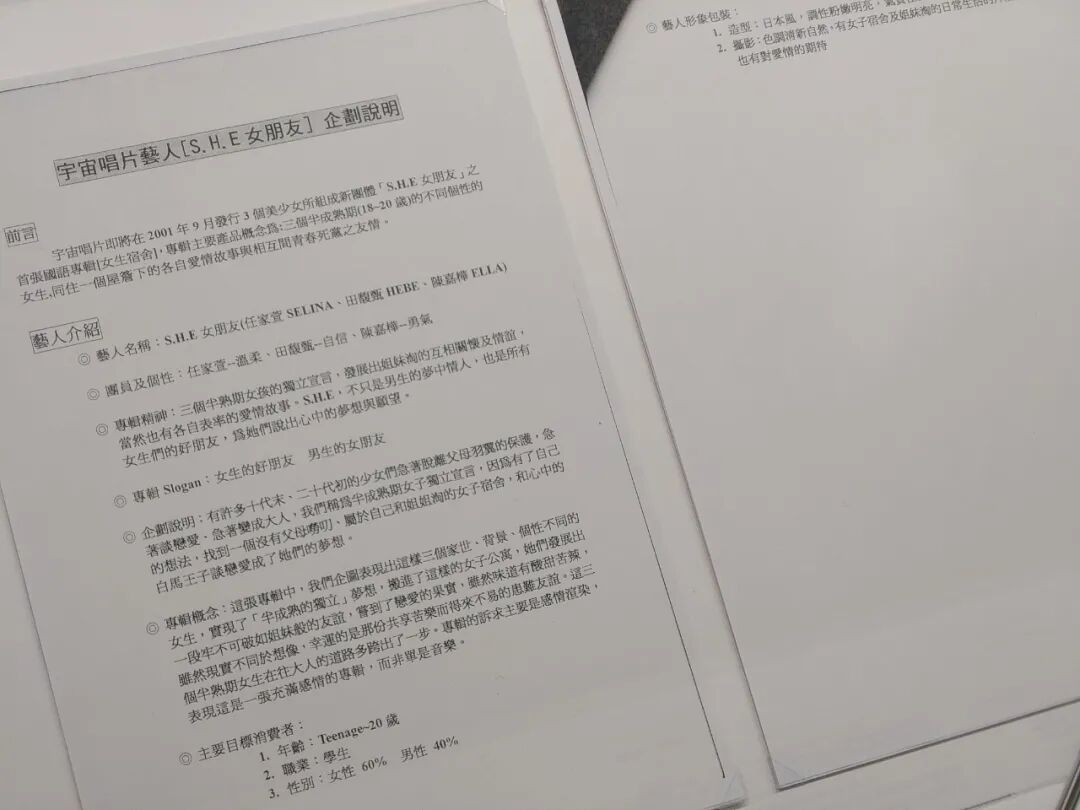 你甚至可以看到2001年S.H.E.成团之初的包装企画书,原来S.H.E.打从一开始就是主攻女性歌迷的”美少女团体”,真夠精准。另外还能见到当年三个女生出道前集训时每天的反省日记。