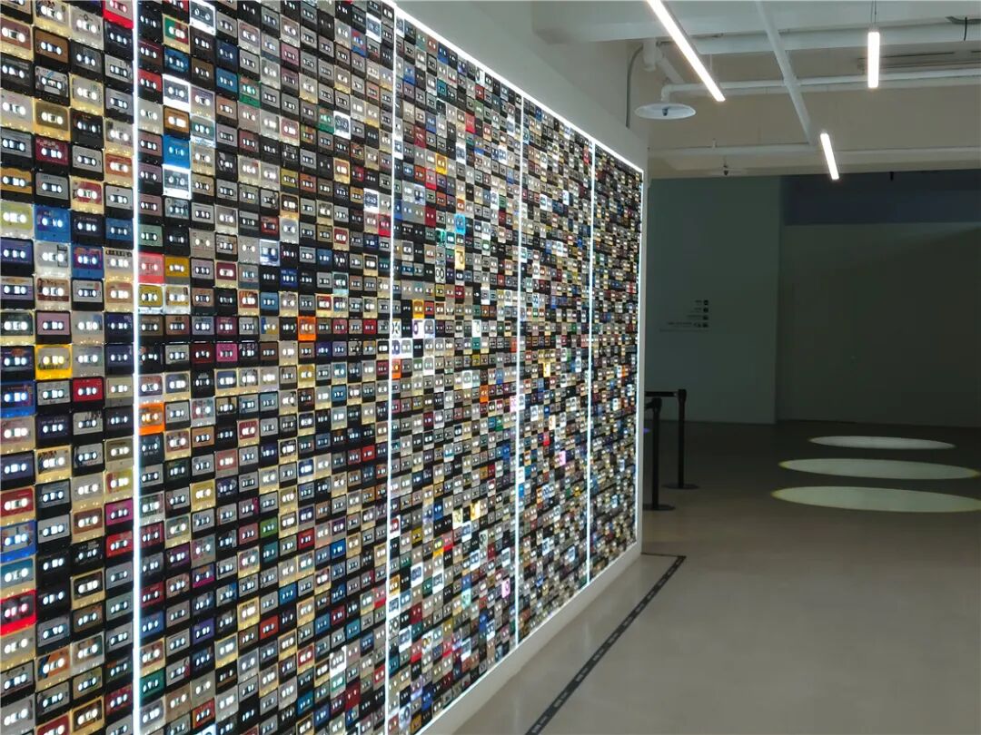 展厅共有三层,要坐电梯到六楼一路往下看,入口处墙上镶满了无数的磁带。走近一看,都是我年轻时候的回忆,甚至好多家里还有,堆在杂物深处,积满灰尘那种。