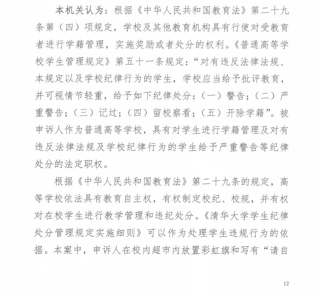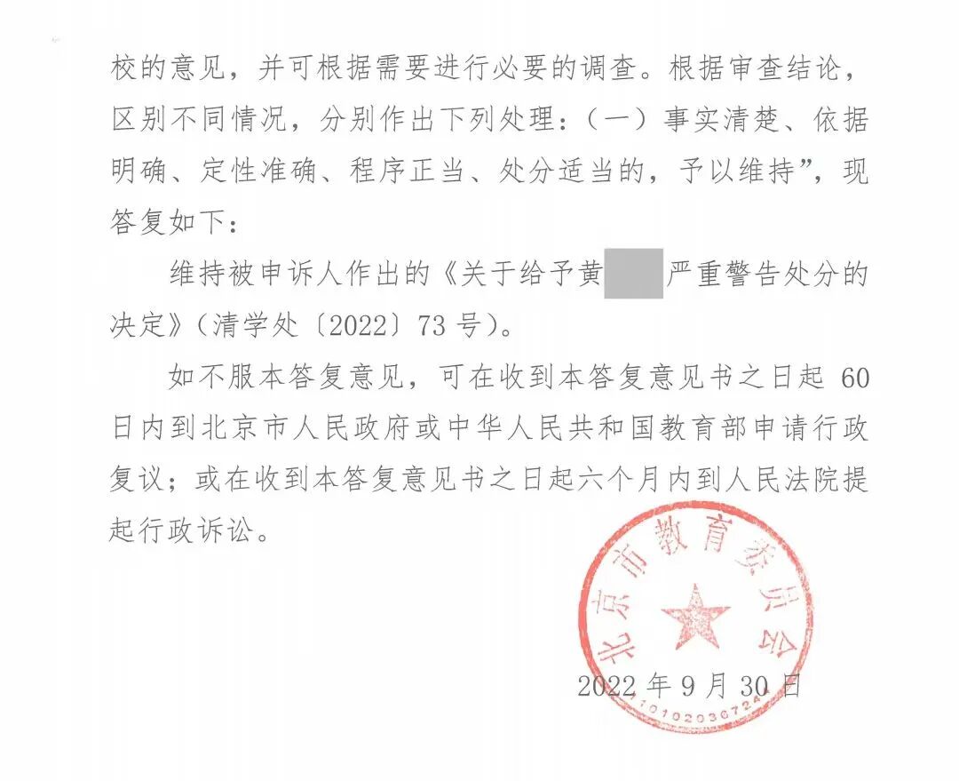 10月,我们终于收到了北京市教委作出的学生申诉答复意见书,答复意见书继续维持了清华的处分决定。