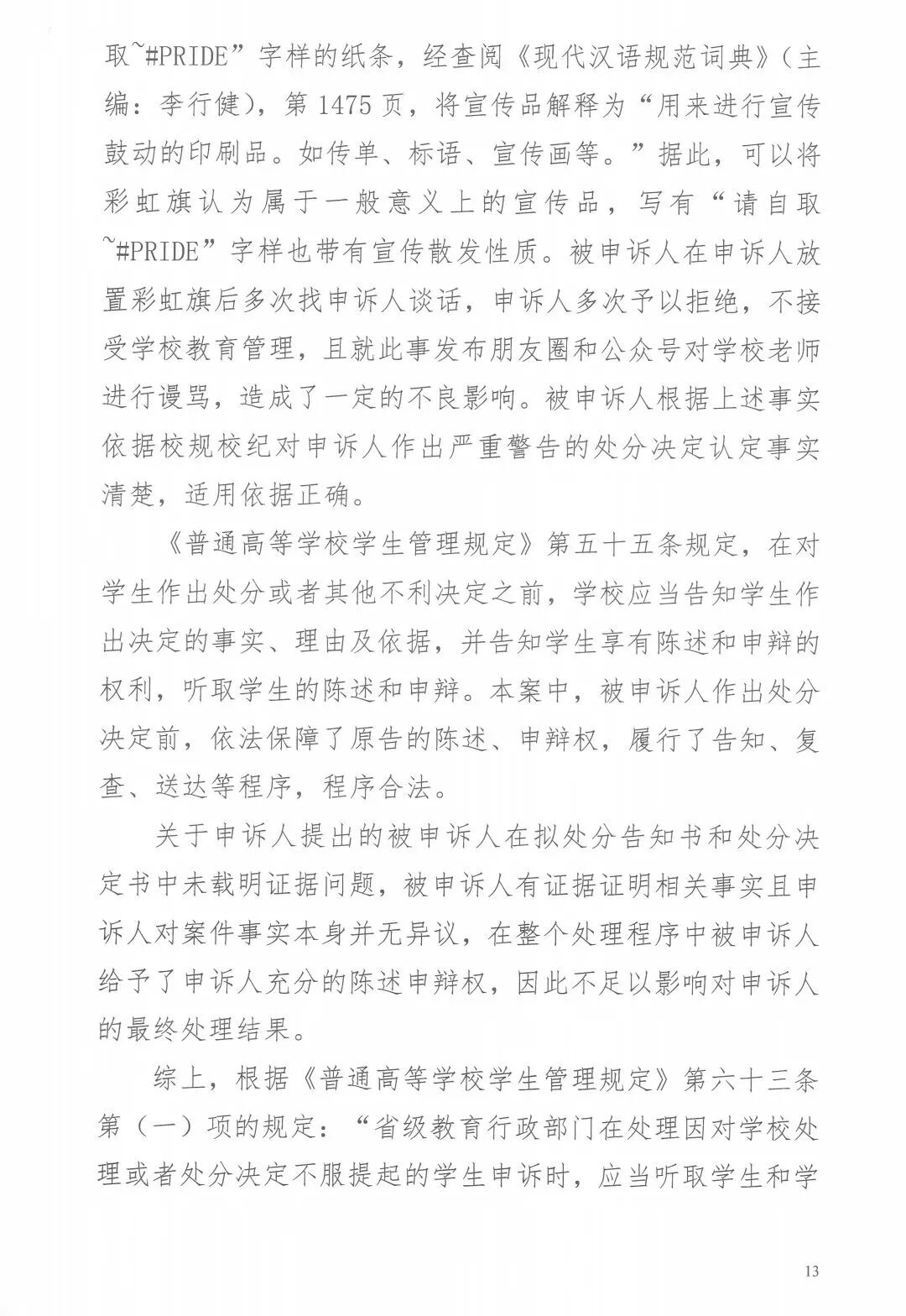 从被处分至今,申请人不断表达彩虹旗不属于宣传品,并要求第三人对校规条款中“宣传品”的定义范围进行解释,但第三人工作人员对此始终未予回应,在拟处分告知书和处分决定中,也没有对此进行任何说明;而在答复意见书当中,如上所述,被申请人对于“宣传品”这一法律概念的解释,也并不能成立。