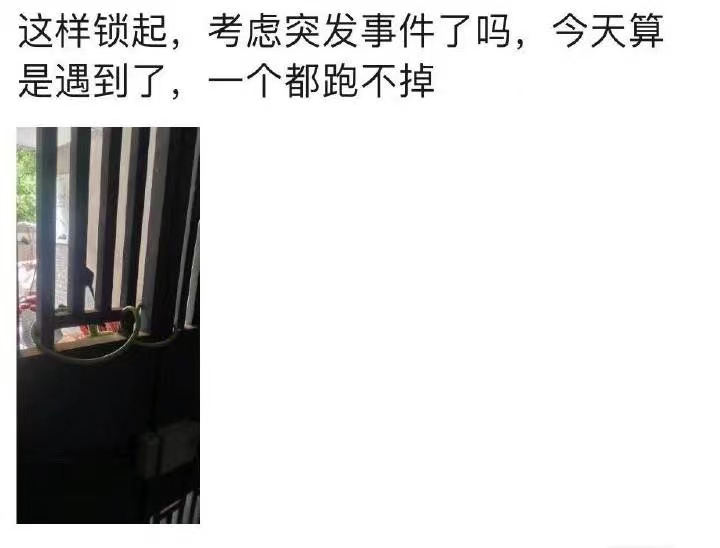 也就是说,为了防疫,可以毫不犹豫地将所有人关在里面,哪怕从来没进行过通道被封锁情况下的应急演练,哪怕可能会因为开门不及时使得逃生机会一闪而逝。