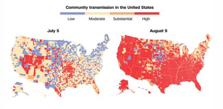 (全美7月与8月新冠病毒传播率水平对比示意图。)