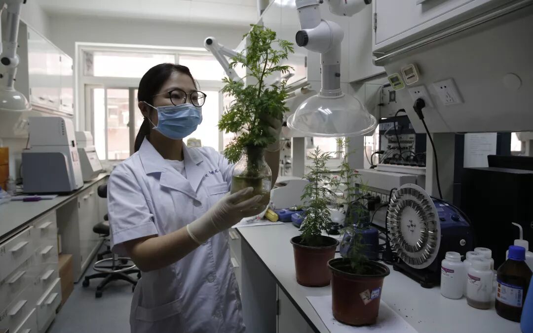 ▲研究人员观察培育的青蒿。新京报记者 侯少卿 摄
