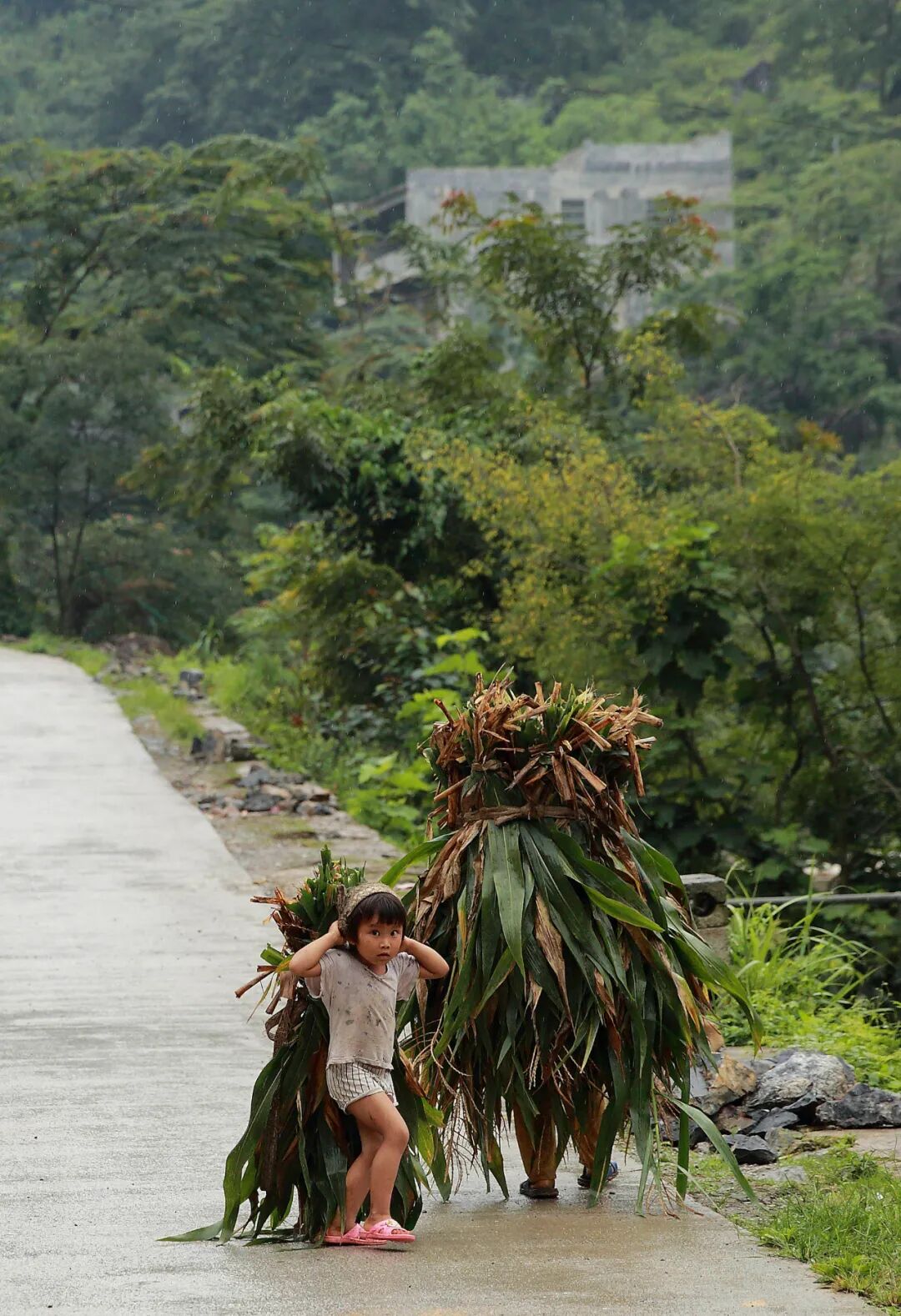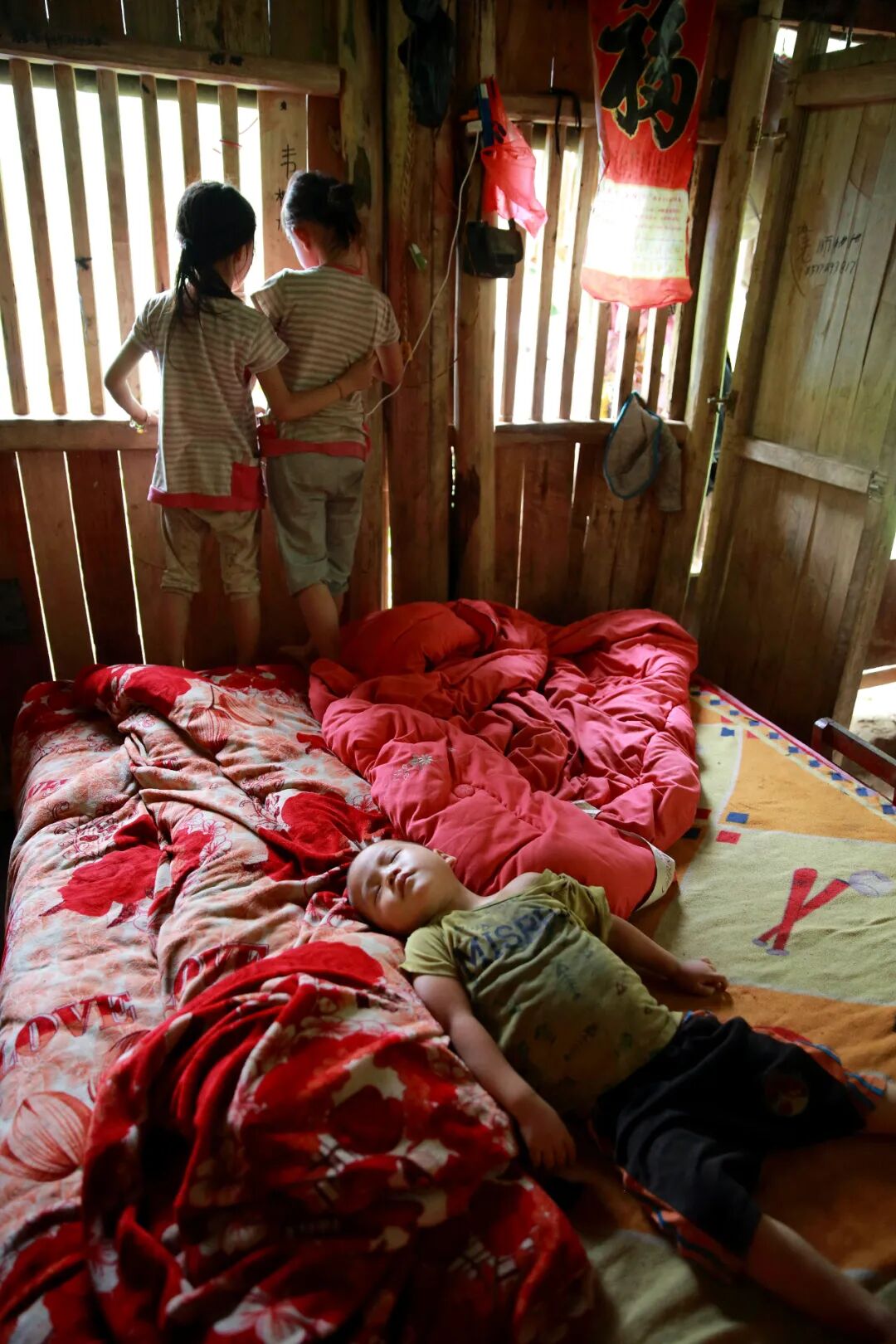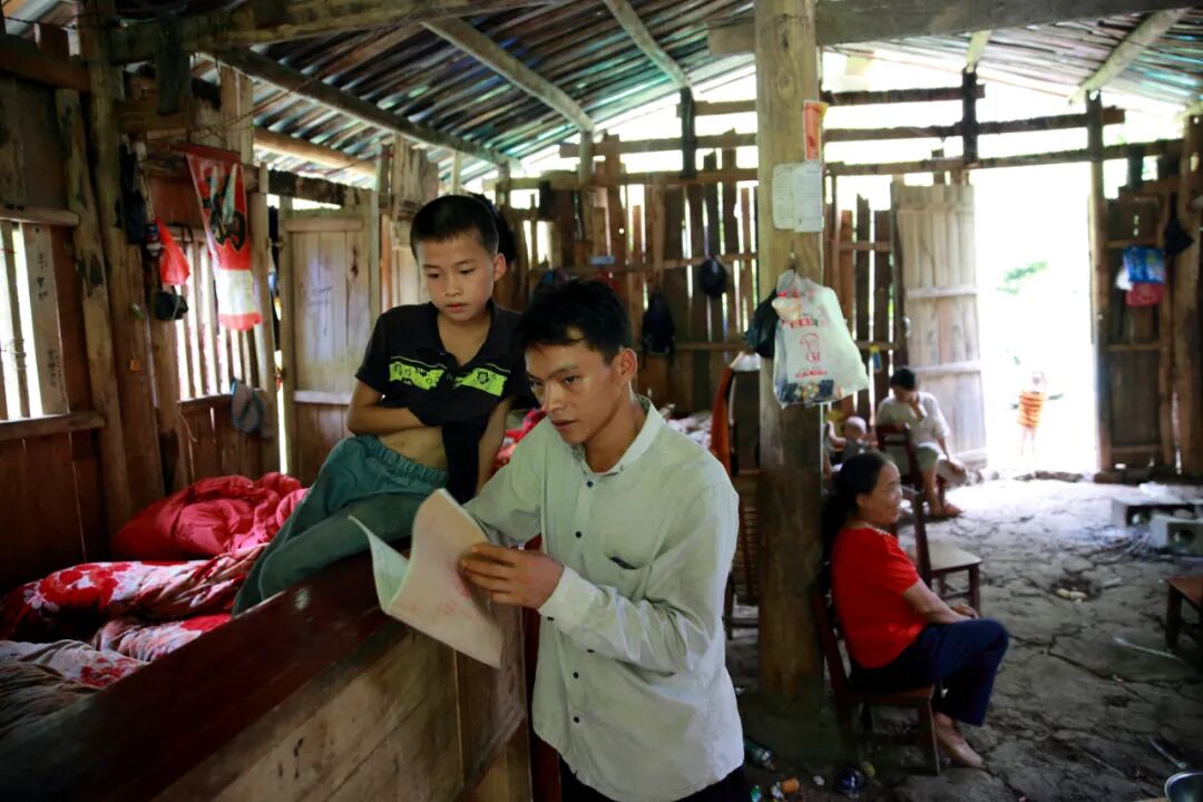 靠门的位置摆放着三张1.5米的大床,占据家里几乎一半的空间。周末时,三张床将被十一口人占据。这天是周四,韦国则家的老大、老二、三妹、小妹四个在几公里外的弄往村小学读书,还有两个在上幼儿园。因为回家的路途太远,放学后直接借宿在韦国则的表哥家,只在周末回来。三岁多的韦英、两岁多的韦峰、一岁多的韦杰留在家里。或许因为年纪小,韦峰、韦杰看起来仍然懵懂的状态,不理人,只是光着脚、露着屁股,在屋子里乱跑,身上、脸上沾满了泥巴与鼻涕。韦英则活泼得多,小小的圆脸不时仰着对着我们笑,也不说话,看起来可爱又天真。险峻漫长的山路,将我们带入一个与城市里的现代文明不同的环境里。我们很快发现,理解这些孩子,“可爱”是最不重要的特质。在这个十一口之家,孩子需要做的是快速学会自己照顾自己,并尽快成长为家里的劳动力。最小的韦杰已经断奶,随大人一起开伙吃饭。吃的是地里种的南瓜苗、南瓜花、猪油、挂面或米饭。也不用人喂,自己站在桌子前,以手送食。饱了,就自己放下碗去玩耍。和哥哥们争抢玩具哭闹时,也不会引来大人的注目。四个已经上小学的大孩子则承担起家长的功能。第二天周五下午,最大的哥哥、12岁的韦伟带着弟弟妹妹,一行四人步行一个多小时到家。他先是去刷锅做饭,给弟弟妹妹们下面条吃。吃过饭,老大、老二要去地里帮母亲种豆子,三妹韦小妹刷碗、四妹韦柳梅照顾其他三个弟弟。分工明确而迅速。贫苦的生活促使孩子们过早承担起家里的劳动,周末回到家,洗碗、做饭、下地干活是他们的日常。