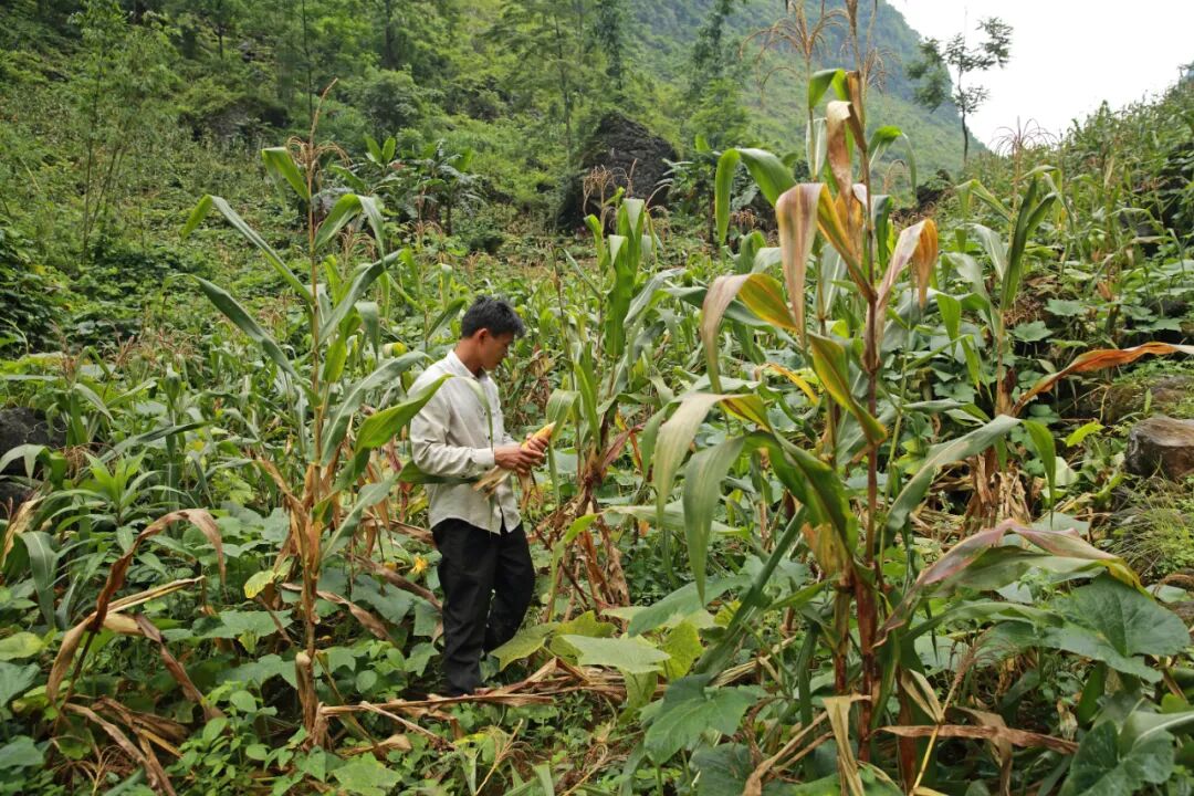 战战兢兢四个小时车程后,我们终于到了保安乡上镇村弄邓组的扶贫安置点,在一个被大山包围的洼地里,统一涂有白色石灰外墙的一层房子并排而立,共计几十户人家。首先映入眼帘的是三句红色宣传标语:“坚持计划生育基本国策,促进人口长期均衡发展”“孕前检查人人参与,优生优育家家受益”“计生服务创千秋基业,人口统筹筑万家和谐”。房子外的水泥空地上,三个没穿裤子的小朋友赤着脚在地上走,一个四五岁大,两个只有一两岁,走路还不稳,最小的那个孩子像刚从水泥坑里爬出来,脸上泥巴快要将五官模糊。看到突然闯入的车辆,三个孩子齐刷刷看过来。从车上拿了两个苹果和一个梨子递给他们,最大的孩子怯生生地接下,转头分给其他两个小朋友。几秒钟的工夫,车子周围已经聚集起三五个看热闹的村民,一个年轻的男子赤裸着上身,怀里抱着一个更小的孩子。“那不少的。”或许是想到韦国则的“出名”事件,男子突然停住,不愿再细说。人群里的村民告诉我们,韦国则并不住这里的房子,他住在山的更深处。我们终于将车子开到了通往韦国则家的路口。接下来的路段,需要步行前往。脚下与其说是道路,不如说是多年来人为压出的一条脚印残迹。灌木丛横七竖八地歪着,阻隔了向前的视线和脚下的路况,我们一边用手拨开,一边提防脚下突现的大石阶与洼地,偶尔手脚并用地向前爬两步。一个小时后,终于在一片低匐的玉米地里,看到了正在割草的韦国则。听说是北京来的记者,韦国则并不多问,带我们穿过一片玉米地和南瓜地,向家里走去。