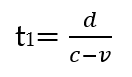 现在,于地球上的观测者B发现:由于飞船速度极为接近光速,光经过了极长的时间才将差距拉开到一定的距离d,可以计算该时间为: