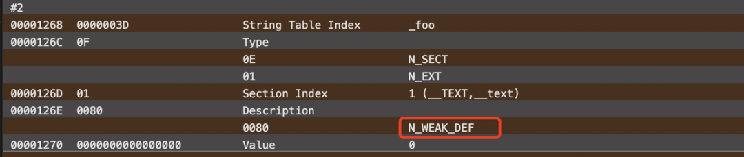 生成的main.o中该函数对应的 symbol table entry 被标记为了N_WEAK_DEF,static linker 据此来区分 strong / weak: