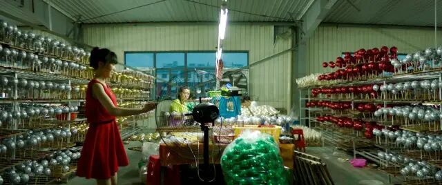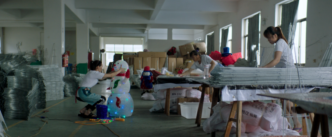 纪录片《圣诞快乐,义乌》剧照任子玉也面临着同样的压力。他工厂的员工大多来自贵州、云南、河南,他一直在招工,基础工资4000多,“还是招不到”。他的想法是,只有提高工厂的效益,才能增加员工福利。比如提高员工的吃住水平,住宿标准,“总的来说,就是提升幸福感”。在工厂里,任子玉把这些未来的图景说给员工听,希望能通过员工继续招工。每每跟员工交谈工作业务,结束时他都不忘加上一句,“介绍老家的人明年来工厂啊!”如果明年还是招不来足够的工人,他能想到的另一种解决方式,就是尽量减少人工,实现全自动化。但这又是对能耗的考验。限电限产会持续多久、会对未来产生多大的影响,他无法估计。现在他的办公室附近有一个展示厅,包装好的圣诞球礼盒展示在白色木架上,强烈、温暖的灯光打下来,营造出节日氛围。这可能是整个厂房灯光最亮的区域,在其他车间,工人们“能少开灯就少开”。