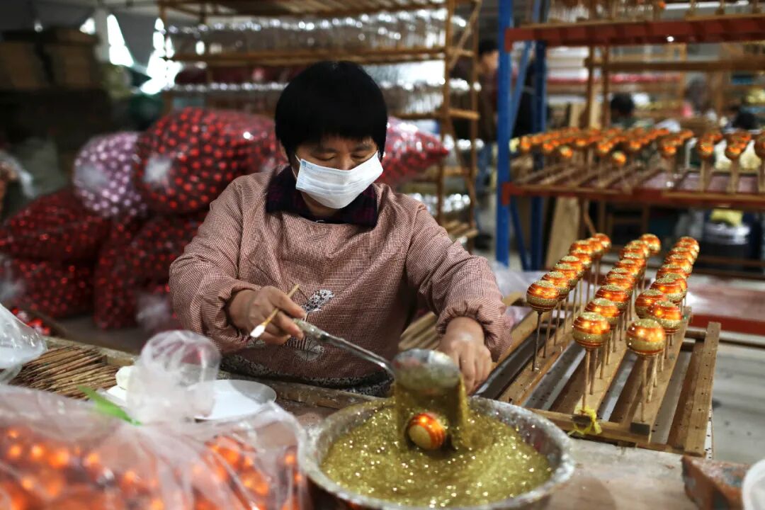 傲珊公司员工在工厂车间加工圣诞球,彩绘后撒上金粉(刘飞越 摄)