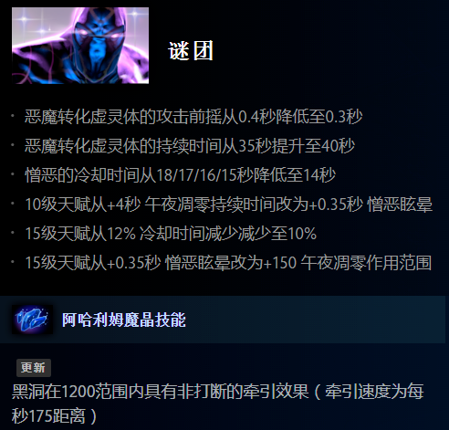 谜团的大招现在可以添加牵引效果,可以有效防止大不到人的尴尬状况。