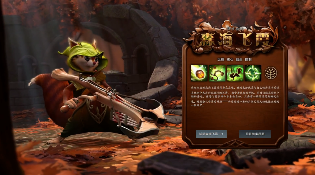 森海飞霞靠近树木时被动地拥有一定几率闪避物理攻击。主动施放时森海飞霞暂时获得移动速度加成,相位碰撞状态和穿行树木效果。