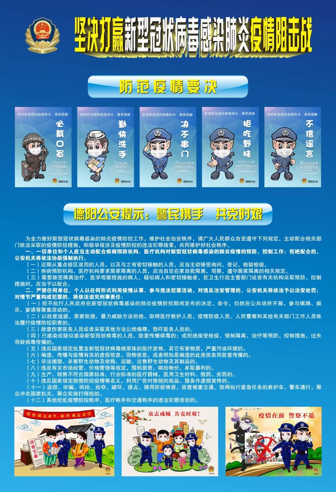 一、在德阳市辖区范围内的一切单位和个人,应当主动配合疾病预防机构、医疗机构对新型冠状病毒感染的肺炎疫情的预防、控制工作;拒绝配合的,公安机关将依法协助强制执行。