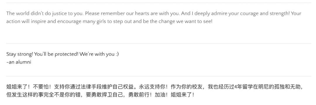 2018年9月,京东创始人、时任CEO刘强东在美国被控性侵,被美国警察现场逮捕。这一轰动整个中文网络的新闻,随着刘强东因证据不足被释放,在京东的大力公关下渐渐沉寂。直到2019年4月16日,当事人Jingyao提起对刘强东和京东的民事诉讼,并公开了起诉书全文,让这一事件重回公众视野。根据Jingyao的起诉书,事发时,刘强东正在参与由明尼苏达大学和中国清华大学合办的工商管理博士项目,该项目专为“中国富有且有影响力的管理者”打造。而Jingyao作为明大商学院的本科生,以该项目志愿者的身份,受邀参加刘强东以京东名义组织的“表彰志愿者”的商务晚宴,却发现自己要独自在餐桌上面对至少十五名中年男性高管。她被灌醉后带离餐厅,遭遇了刘强东的猥亵和强奸。她的经历引起了许多留学生的共鸣。明大校友、当时在新泽西就读硕士的赵丫丫认为,这些所谓的商学院合作项目,是代表知识权威和国际化的美国高校,和中国的大资本家之间的利益交换。年轻漂亮的中国女生被选为志愿者,为这些男性企业家提供高度性别化的服务和情感劳动,也被投入了一个随时可能被狩猎的危险环境。而学校在事发后没有为处境脆弱的国际本科生Jingyao提供足够的支持,相当于牺牲她来保护更有权势的校友——“如果刘强东也算是校友的话”。同时,赵丫丫所在的中国校友圈子里,却鲜有人公开表达对受害者的同情。她的男性朋友、同学用戏谑的语气谈论案件,开“我的母校出名了”一类的玩笑。这让她受到很大的冲击:“我觉得我不认识他们了。”她想,或许很多人和自己一样,也在默默地支持Jingyao,但大家的声音被压抑了。她想做点什么,让所有人聚在一起,变得可见。2019年4月18日,她和几位校友建立了名为“明尼苏达大学校友和Jingyao的朋友们(UMN Alumni and Friends for Jingyao)”的联署网站,通过邮箱征集留言并发布。她希望参与者不只是签名,而是写下自己对Jingyao的支持,因为重要的是展现“每个人是怎么想的”。在她意料之外,联署的影响力远远超出校友的范围。截至4月21日,她们共收到3700条留言。因为没有钱使用网站的付费功能,她们一条一条复制粘贴了所有信息。明大校友留言“可以想象有多少中国的女性留学生在经历同样的事情。”加拿大温哥华的本科留学生七七说。她指出,留学生在海外并没能远离国内的性别文化和权力关系,她们的遭遇正是其衍生品。七七是微博#MeToo在中国#话题的创建者,此前一直关注Jingyao案,赵丫丫发起的联署促使她更多地投入其中。她加入了“助力Jingyao翻译小组”,一个30人的线上志愿者团队。当时中文网络充斥着各种关于案件的扭曲不实的信息,起诉书中一些关于性侵的细节也被媒体截取和放大。七七震惊于媒体“黄色小说”式的报道。为了负责任地传递案件信息,她和小组成员翻译了一万两千多字的起诉书全文,很快获得“10万+”阅读量,为Jingyao争取了不少来自国内女权社群的支持。这个过程里,志愿者是在和京东的公关抢时间。4月22日起,案发当晚餐厅和公寓内的录像,以及Jingyao和刘强东律师的英文通话录音,被截取对Jingyao不利的片段在网络曝光,并在信源不明的情况下,迅速被新浪科技、凤凰网、南方都市报等主流媒体报道,配以“仙人跳实锤”“女方自愿”“索要钱财”等引导性极强的标题,经由水军和营销号大肆传播。此后网络舆论对刘强东呈现几乎一边倒的支持,而Jingyao受到全网规模的网暴,持续至今。但七七受到的冲击正相反,在于:一个有权有势的人,可以利用信息不透明和国内外的不同语言环境,如此轻而易举地歪曲一个受害者的叙事。即使在被剪辑的餐厅视频里,她也清晰地看到一个资本家“兄弟会”对一名年轻女性的共谋:“你可以一次一次地数出来她被劝了多少次酒。”她震惊于所有人都曾“在那个酒桌上”,却对如此熟悉的酒桌文化的一幕视而不见。开始七七和小组成员试图还原完整的监控视频,并通过细节逐一回应对Jingyao的攻击。但工作量实在太庞大,且后来她意识到,再多细节的解读也无法改变公众对Jingyao的看法,“因为我们缺乏文化上的讨论”。当时MeToo运动在中国已发展了一年,越来越多的性暴力幸存者公开讲述自己的经历,但人们对这些故事的选择性接纳,仍取决于当事人是否符合他们对“完美受害者”的想象。七七觉得,要让受害者的勇气得到回应,需要改变整个社会谴责受害者、宽容施暴者的强奸文化。