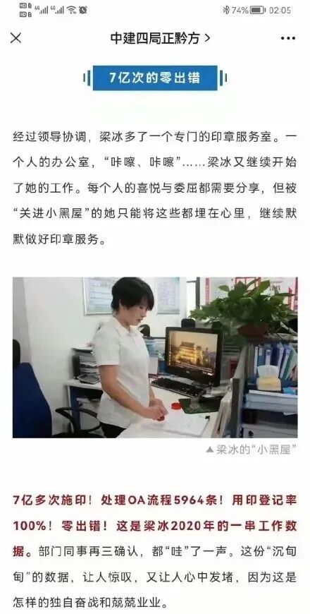 在过去一年时间里,梁冰7亿多次施印,处理OA流程近6000条,用印登记率100%而且零出错。