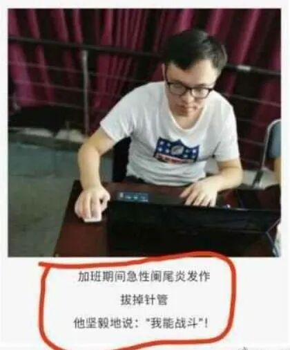 一是,某员工加班期间急性阑尾炎发作,他拔掉针管,坚毅地说:“我能战斗!”。