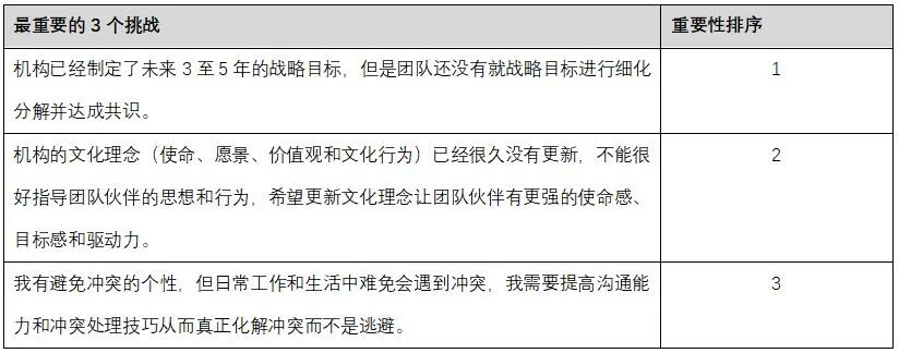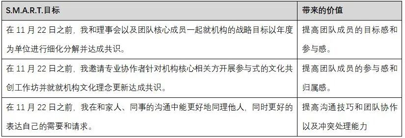 1. 随着机构的发展,机构对人才需求增加,但目前的薪酬体系和发展通道如何能吸引和留住人才?2. 随着机构人员的增加,员工的需求和期望也在增加,管理难度增大。3. 在公益组织,应该如何设定制度、开展绩效管理和激励才能达到最大绩效。4. 机构当前的业务模式下,如何实现项目规模和项目成效的平衡?5. 在中国当前大多数国民没有捐赠习惯的情况下,如何实现机构多元、稳定和可持续的资金来源?6. 在当前同事能力未达预期的情况下,管理者应该如何合理授权?7. 我有避免冲突的个性,但日常工作中团队难免会遇到冲突,我应该如何进行有效沟通和冲突处理?8. 如何让每一位同事和我一样有更强的使命感、目标感和驱动力?9. 民主决策还是效率优先?这个在公益机构如何平衡?10. 对于机构未来发展的战略目标,团队内部还没有完全达成共识。11. 机构的文化(使命、愿景、价值观、原则和行为准则)已经很久没有更新,不能很好指导员工的思想和行为。12. 家庭对于我收入的期待与实际情况可能较大的差距,在日常生活中遇到较大的投入部分可能会和家人尤其是妻子有分歧或冲突。然后sandy问我,针对以上的挑战,思考你想得到的理想结果是什么?1. 机构在3-5年内可以为员工提供体面、合理的薪酬,在行业内乃至与企业相比也有一定的竞争力;同时,我们的员工成长体系和发展通道可以更加完善,从而可以吸引到更加优秀的人才愿意加入。2. 每个部门的中层管理者能稳定下来,同时有较强的管理能力和领导能力,能带领和成就每一位基层的员工。3. 制度和流程建设会越来越完善但不会导致机构复杂臃肿、效率低下;机构能建立简单有效的绩效管理制度,作为员工的绩效反馈,帮助员工持续改进。4. 我们将现有业务模式和项目活动跑通并验证其成效,我们除了自身不断投入人力和财力资源拓展新的项目区域外,我们可以赋能更多合作伙伴,帮助更多希望推动乡村儿童阅读推广的人和组织获得成功。5. 在5年内实现年度捐赠收入规模达1500万,60%以上都来自公众捐赠,并且月捐和年捐收入占比超过50%。6. 为现有团队成员提供持续的能力建设培训,同时不断提高团队管理者的授权能力。7. 我能更自信、更从容、更有技巧的面对冲突和处理冲突。8. 在工作中能有目标感和计划性,有较强的学习能力和自我驱动力,遇到问题不抱怨,主动寻找解决方案。9. 在机构内部,既能让大家有较强的参与感和主人翁意识,也能够保持机构的运营效率。10. 大家对于机构的战略目标有共识,明确后坚定地朝着目标前行、投入资源、坚定执行,遇到问题及时复盘和调整。11. 大家对于机构的文化(使命、愿景、价值观、原则和行为准则)有深入的共识,并且因此为傲,愿意作为机构文化的守门人。12. 一方面个人的收入能够稳步提高到合理水平满足家庭生活的需要,另一方面家人对于我的事业的价值产生更大的认同感。考虑到每个人的时间和精力都是有限的,Sandy说,目标设定很重要的一个原则就是要聚焦,因为没有重点就相当于没有目标。随后,Sandy设计了一个三角沟通,让理事长Cherry和我一起就我设定最重要的3个挑战以及我在课程期间要达成的三个目标进行了充分沟通并达成共识:![]()