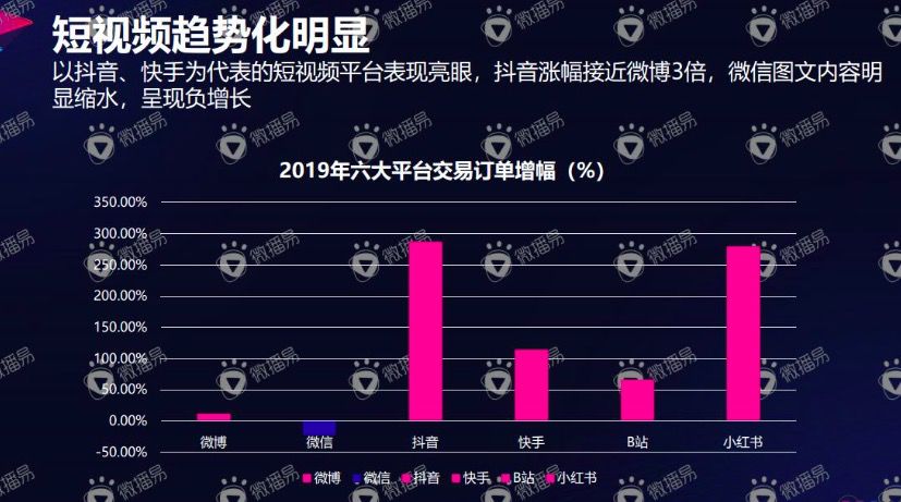 回顾2019年,整个社会化媒体行业发展繁荣一片,从平台交易情况显示,以抖音和快手为代表的短视频平台发力明显,其交易量增幅是微博平台增幅的3倍,以图文为主的微信公众号内容热度下降,市场需求从图文转向短视频内容趋势明显。另外以社区种草分享为主的小红书平台表现亮眼,越来越多的人倾向于以好物分享的形式表达生活。
