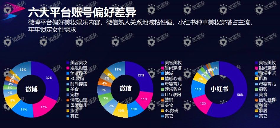 2019年,头部比重需求缩减,资源向腰部和尾部倾斜。微博、B站头部资源缩水,抖音B站小红书腰部账号涨幅较大。日常生活类账号更偏向抖音,时尚穿搭类更偏向微信,美容美妆集中在双微和小红书平台。