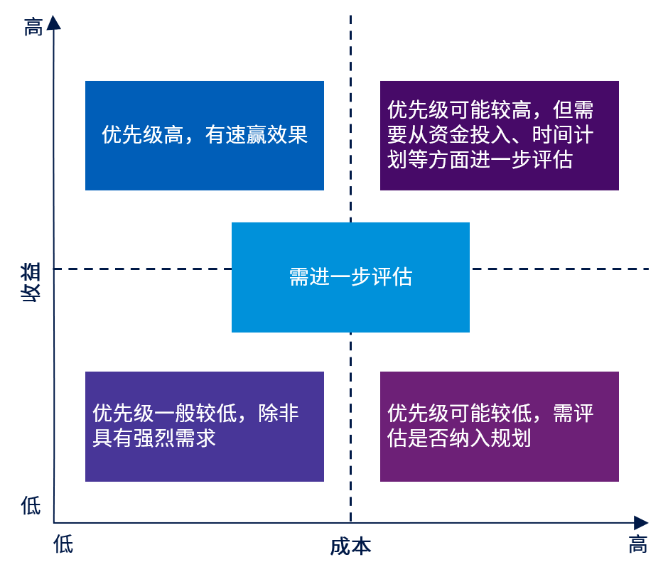 可用资源及预计回报将影响具体转型措施的取舍,对于投入资源多、预计回报少的举措,可能不被纳入规划。