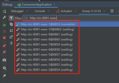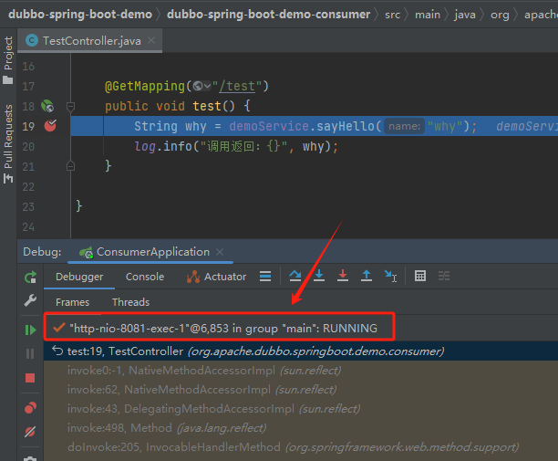 在方法入口处打个断点,这个 http-nio-8081-exec-1 不就是 Tomcat 容器线程池里面的一个线程吗: