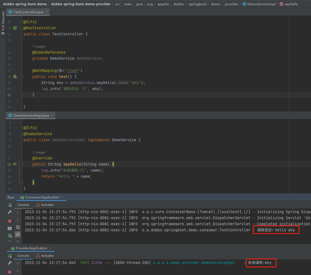 上面这个 Demo 启动起来之后,通过 Http 接口发起一次调用,看到控制台服务提供方和服务消费方都有对应的日志输出,准备工作就算是齐活儿了:
