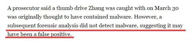 不过,在北京时间今天凌晨1点开始的庭审上,此前曾宣称张玉婧的U盘里有病毒的美国检方突然改口,称后续的检验发现张玉婧的U盘里其实没有恶意软件,起初特工认为她携带恶意软件可能是误报。