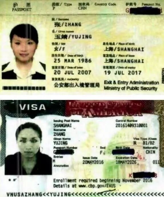▲图为美国媒体公布的张玉婧的两本护照和美国签证,其中第一本已到期,但因为她的美国签证是2016年获得的,所以她去美国携带了新旧两本护照。目前她的美国签证已被吊销。
