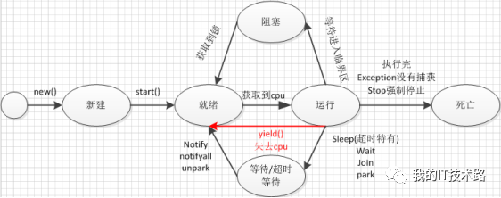 结束(TERMINATED):就是这个线程执行完了任务,或者遇到了没有捕获的异常,又或者主动关闭线程,那么这个线程的资源被收回,该线程也不会在占用cpu。